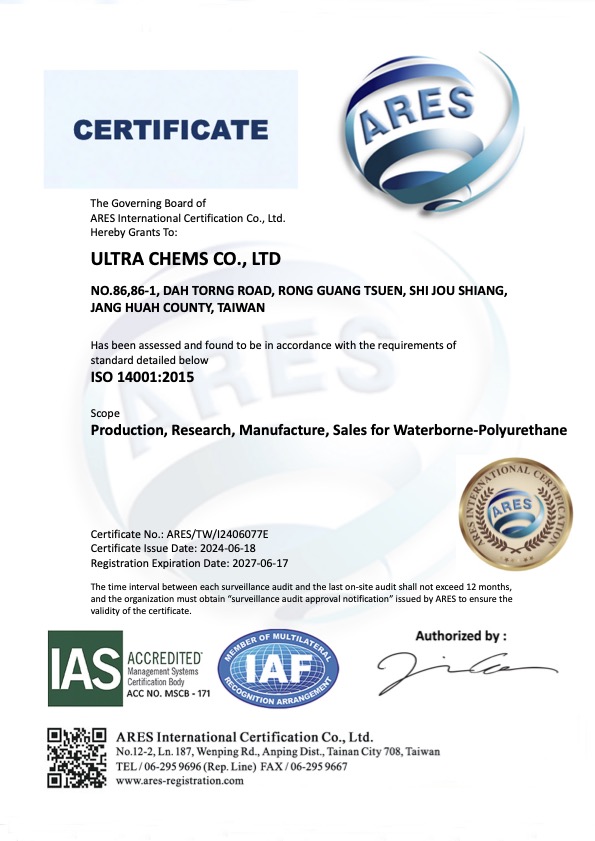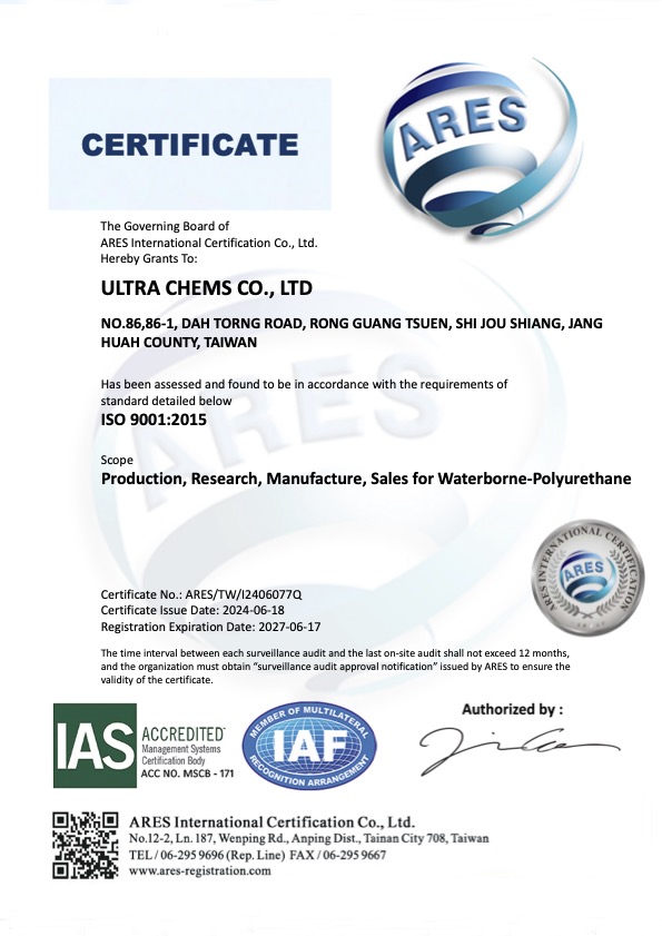 ULTRA CHEMS Co.,Ltd. was founded by Dr. Chan Yi-Hung in 2005 and has been operating for twenty years. The company specializes in the research, development,and production of water-based polyurethane (PU), with a mission to become a leading manufacturer in this field. Over the years, Ultra Chems has upheld a core value of "Professionalism, Innovation, and Sustainability," delivering high-quality products to customers worldwide.